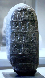 Boundary stone (kudurru) of the Kassite ruler Melishipak (r. 1186-1172 BCE) at the Louvre Museum, showing in the top right corner an inverted Ω thought to be a symbol of the mother goddess. Sb 22. (c) RMN.