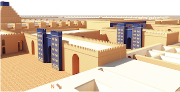 Reconstruction of the Main Courtyard and the façade of the throne room with glazed brick decoration, looking south. Adapted from O. Pedersén, Babylon: The Great City, fig. 3.17.
