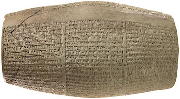 BM 121006+, a six-column clay prism that is inscribed with the so-called "Prism T[hompson] Inscription" of Ashurbanipal. Ehulhul's reconstruction is recorded in cols. ii–iii. © Trustees of the British Museum.