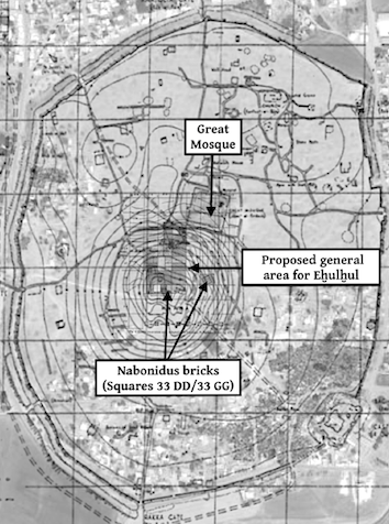 British and Turkish excavations of the ruins of Harran in the 1950s, 1980s, and 1990s have not unearthed a single inscribed Assyrian object, nor have these scientific investigations found the remains of Ehulhul, apart from numerous bricks and half-bricks of Nabonidus. It is possible that the temple complex was located near the edge of the city's citadel, possibly in the northeastern quadrant. Given the (oral and) written tradition that the Paradise Mosque was constructed on top of Ehulhul, and the fact that numerous stamped bricks of Nabonidus were found in trenches 35 DD and 36 GG and that steles of that Neo-Babylonian king and his mother Adad-guppi were reused in the structure of the mosque, it is not impossible that Sîn's temple was located in the northeastern part of the mound (höyük). This proposed location, however, is yet to be confirmed from the archaeological record.