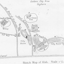 [/kish/images/moundw-fig3-large.jpg]3. خارطة لانغدون التخطيطية لكيش،وتظهر ما يسمى ب "المكتبة" كمجرد كتلة في الجنوب الغربي من تل W. الخارطة ليست مطابقة للقياس. المصدر: Langdon 1924: pl. 33 top.