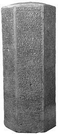 Two complete hexagonal clay prisms and several fragments of prisms from Nineveh are inscribed with a text describing eight of Sennacherib's military campaigns and the construction of a new armory. This inscription contains material from texts written earlier in the king's reign (especially those written in 694–692) and material composed anew for this text and other inscriptions written in 691 (Sennacherib's 14th regnal year). Like text no. 18 and text no. 23, the military narration of this edition of Sennacherib's res gestae includes accounts of eight campaigns: (1) against Marduk-apla-iddina II (biblical Merodach-baladan) and his Chaldean and Elamite allies in Babylonia; (2) against the Kassites and Yasubigallians, and the land Ellipi; (3) to the Levant, against an Egyptian-led coalition that had been organized by the nobles and citizens of the city Ekron, and against the Judean king Hezekiah; (4) against Bīt-Yakīn; (5) to Mount Nipur and against Maniye, the king of the city Ukku; (6) against the Chaldeans living in Elam and against Šūzubu (Nergal-ušēzib), the king of Babylon; (7) against Elam; and (8) the battle of Ḫalulê, where Assyrian forces battled Babylonian and Elamite forces led by Šūzubu (Mušēzib-Marduk), the king of Babylon, and Umman-menanu (Ḫumban-menanu), the king of Elam. Accounts of the events of the king's 9th and 10th regnal years (696 and 695), the campaigns undertaken by his officials to Ḫilakku (Cilicia) and the city Tīl-Garimme, however, are not included among the king's victories on the battlefield. In the building report, Sennacherib says that after he had completed the "Palace Without a Rival" (the South-West Palace) he started work on an armory, which he refers to as the ekal kutalli (the "Rear Palace"). He tore down the former palace, which he complains was too small, poorly constructed, and dilapidated. On a high terrace built upon a new plot of land (the Nineveh mound now called Nebi Yunus), Sennacherib constructed a new palace consisting of two wings, one in the Syrian style and one in the Assyrian style, and a large outer courtyard. He decorated the building in a fitting fashion, which included large limestone bull colossi stationed in its gateways. The two complete exemplars preserve a date. One (ex. 2) was inscribed in the eponymy of Bēl-ēmuranni, governor of the city Carchemish (691), and the other (ex. 1) was inscribed in the eponymy of Gaḫilu, governor of the city Ḫatarikka (689). The inscription is commonly referred to as the "Chicago Prism" or "Taylor Prism" (or "Taylor Cylinder" in earlier literature). Ex. 1 is named after the city in which it now resides (Chicago, in the Oriental Institute of the University of Chicago); ex. 2 is named after Col. J. Taylor, who first acquired the object. The text has also been wrongly called by D.D. Luckenbill (and other scholars) the "Final Edition of the Annals."