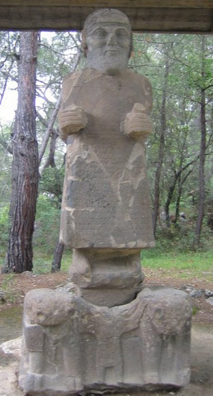The storm god of Que: monumental statue of the god standing on his chariot, with an inscription in the Phoenician alphabetic script (mid-8th century BC). Found at Azatiwadaya (mod. Karatepe) and now on display in the Karatepe-Arslantaş National Park.