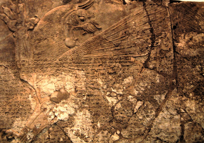 In another cosmic battle, the warrior god Ninurta defeats the lion-eagle Anzu, who has stolen the gods' Tablet of Destinies and is using it to try and turn back time. Detail from the stone decoration of the temple of Ninurta at Nimrud, c.865-860 BC (BM ANE 124571-2). Photo by Eleanor Robson. View large image.
